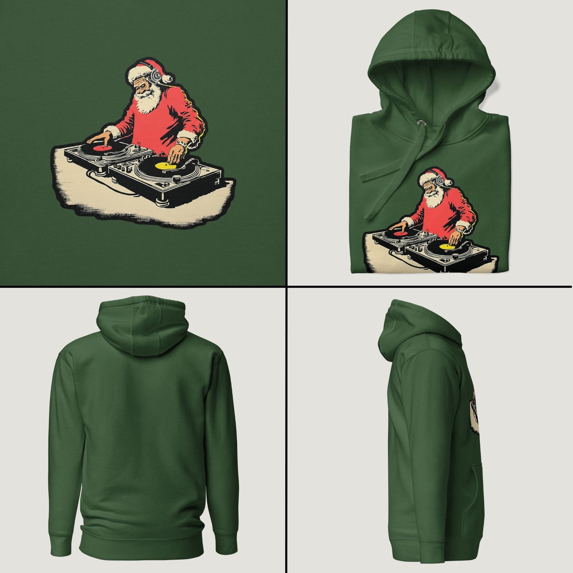 Santa's got the elves lost in the beat. Retro graphic on quality fabric. The holiday hoodie for people who draw the line somewhere before light-up sweaters.